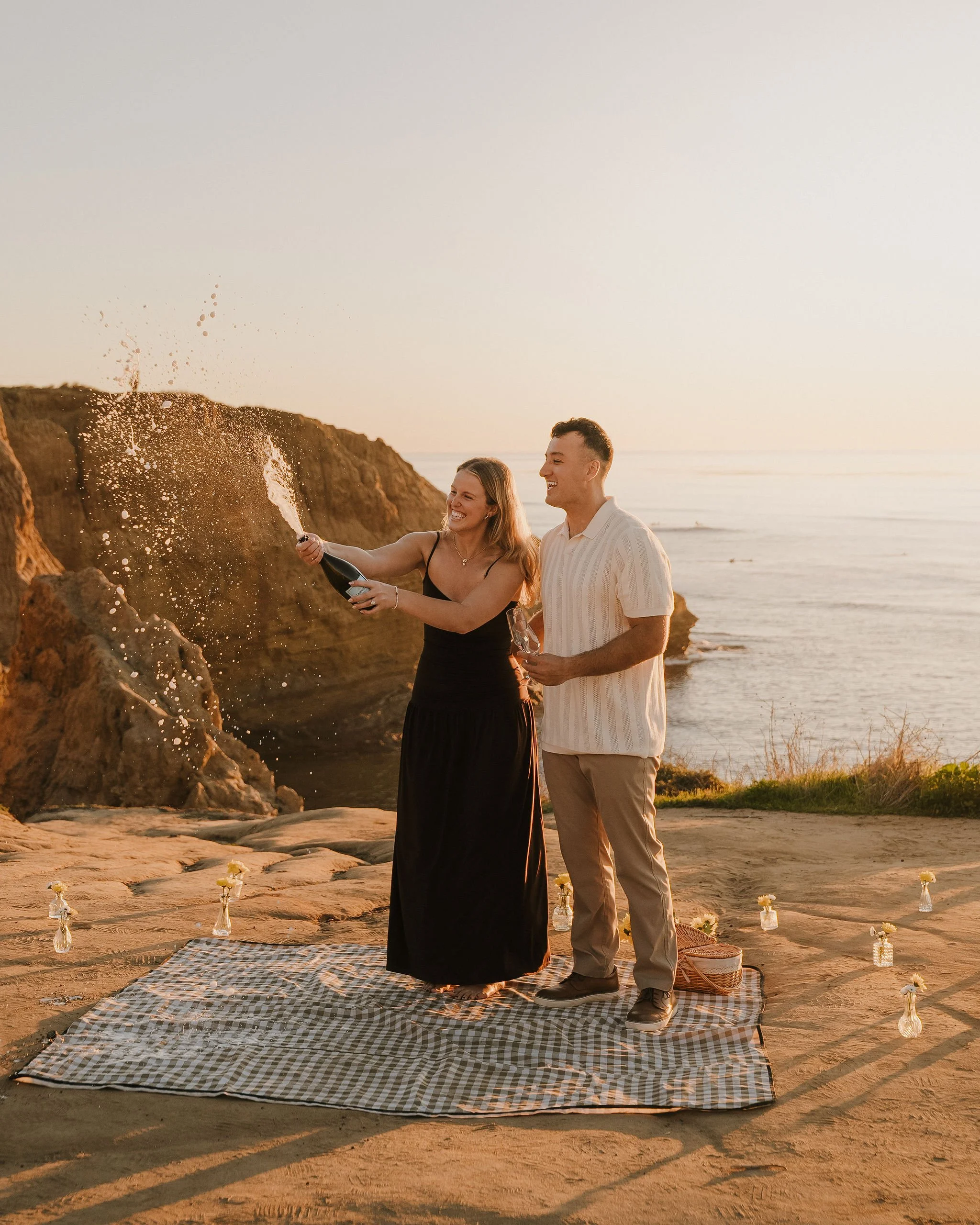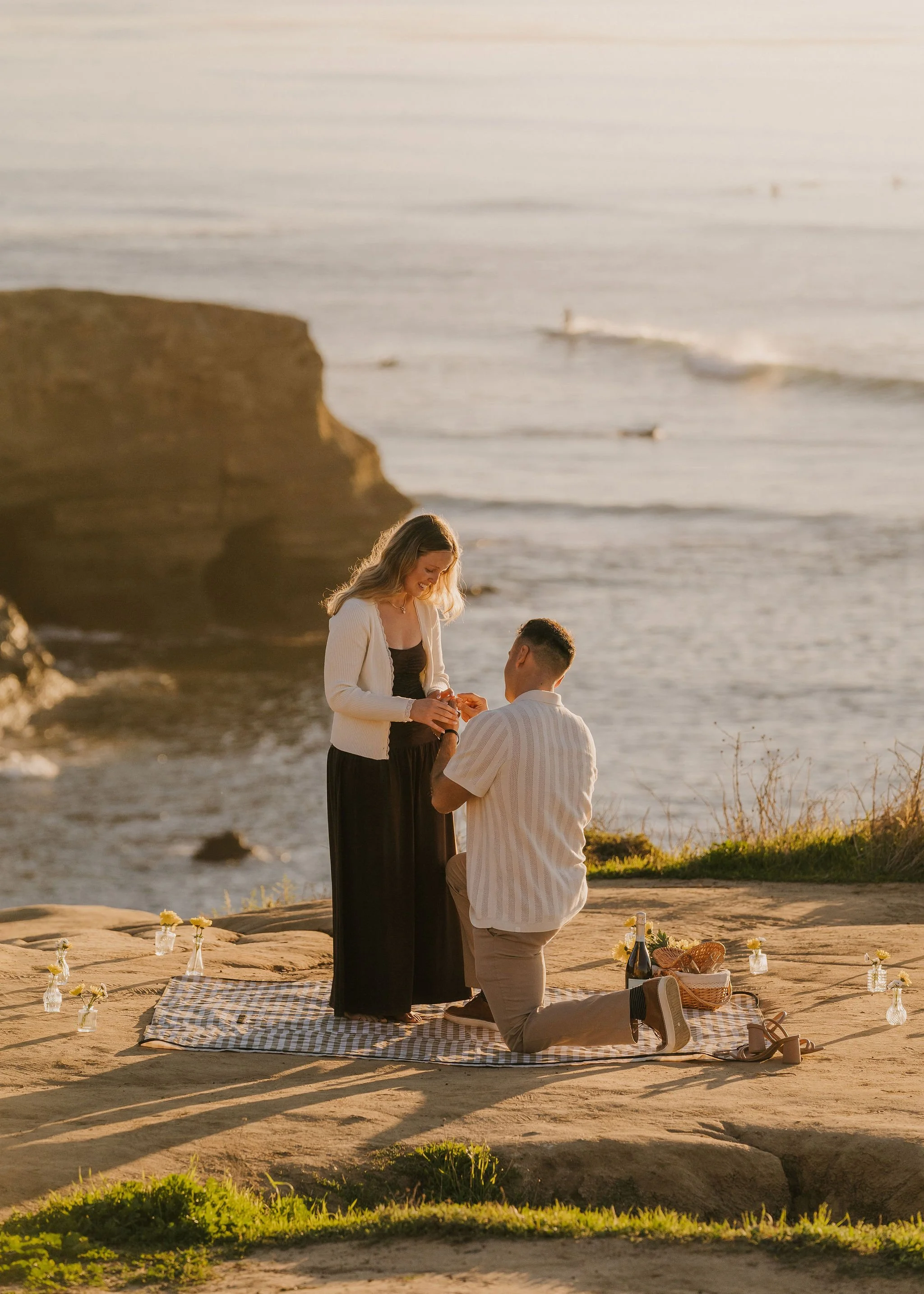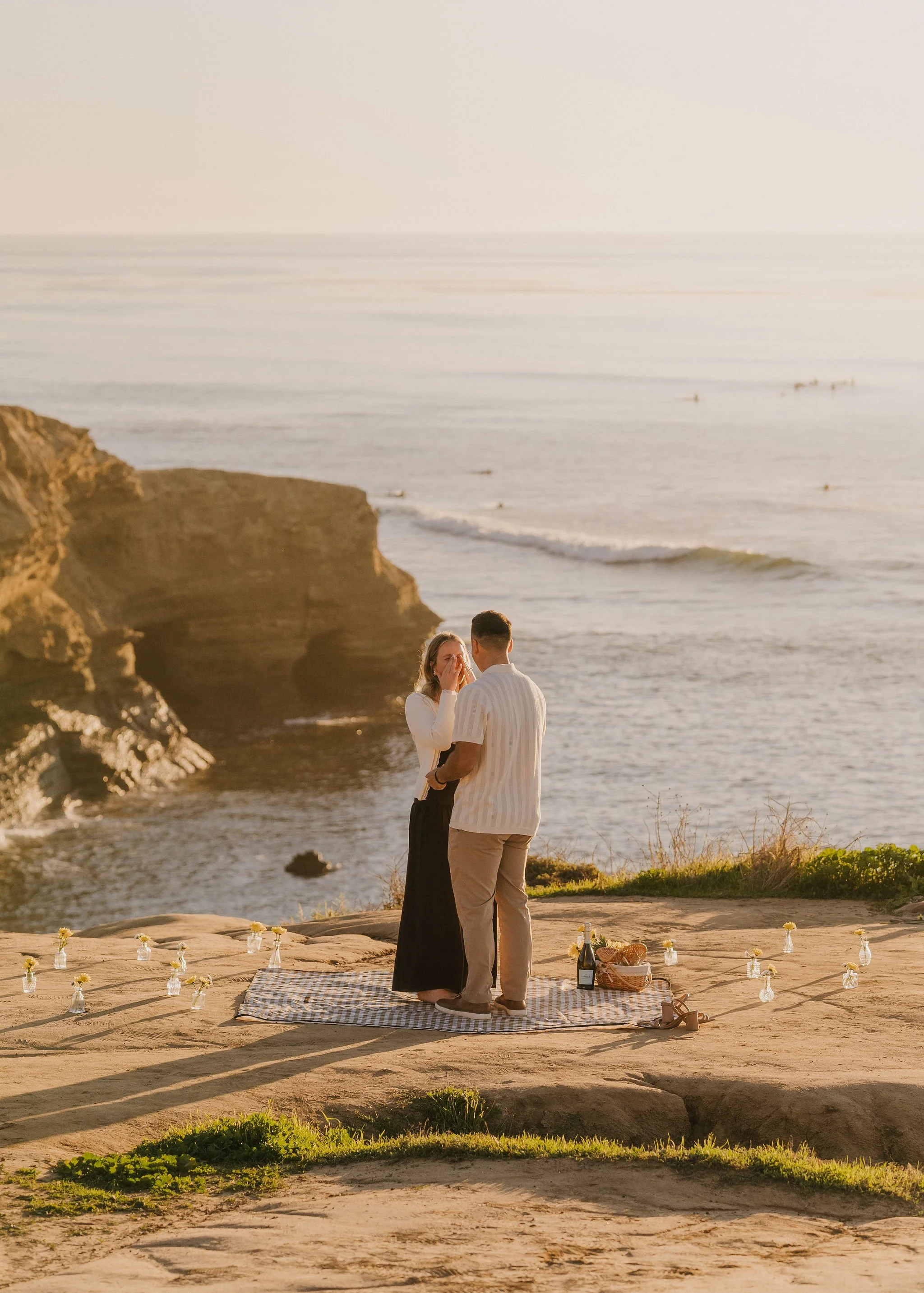 Before they arrived, I set up a little picnic overlooking the ocean — blanket, champagne, flowers, the works. Nothing over the top, just something simple and thoughtful tucked into one of those quiet cliffside spots where you can hear the waves echoing below.